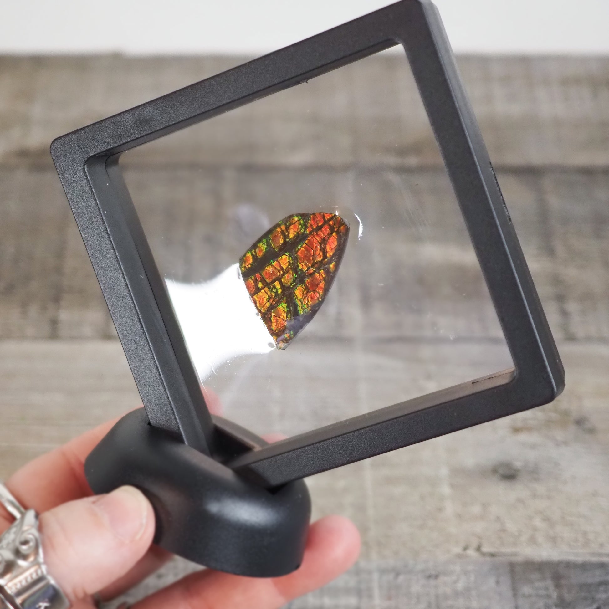 This Ammolite specimen is about 1" x 1" (27.5mm x 21.7mm) of beautiful red, green, and gold dragon scale flash! It will come in a floating display frame similar to the one shown.
