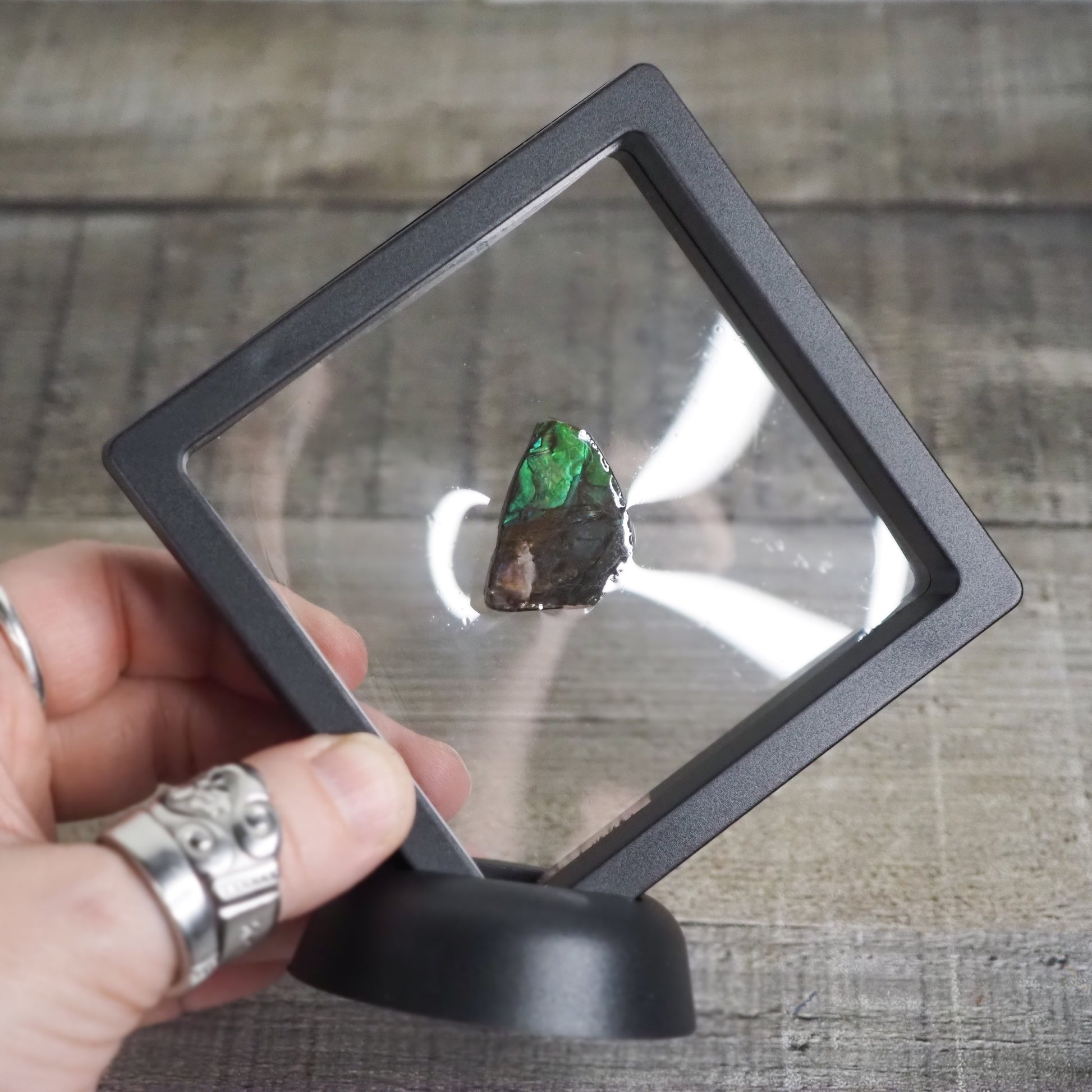 Ammolite is covered with a resin by the preparer of the fossil in order to stabilize its beautiful Aragonite coating.