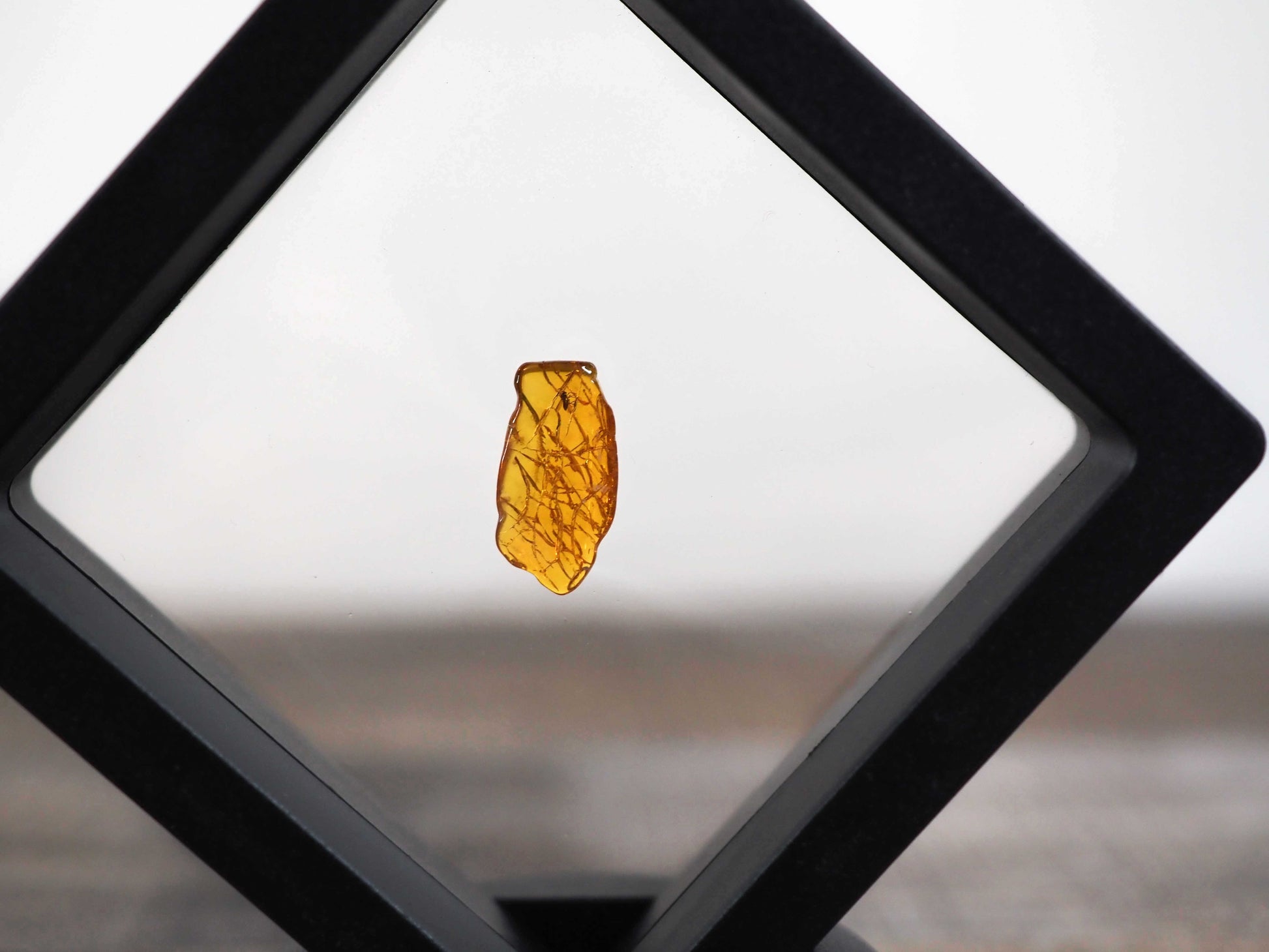 This 16mm piece of Baltic Amber comes in a 4" x 3.75" floating frame and has a tiny wasp inclusion.