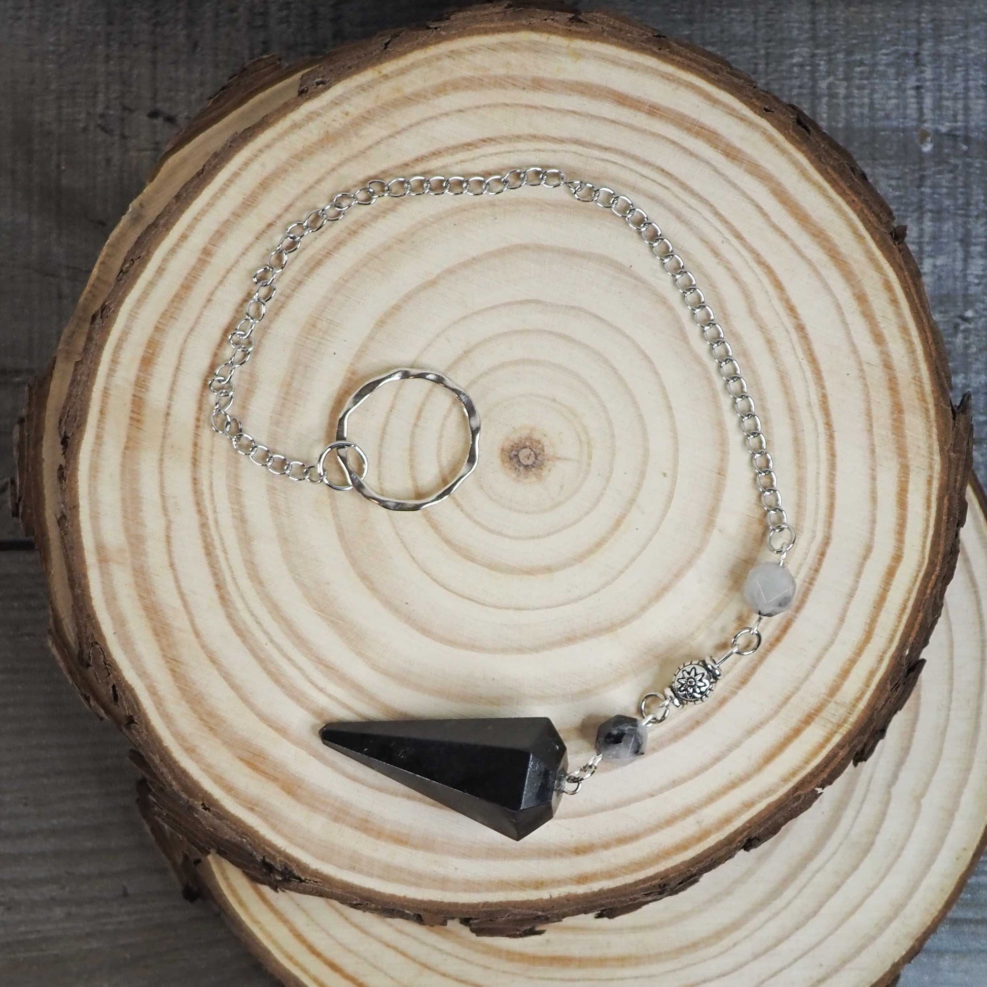 This beautiful Black Tourmaline pendulum features a sterling silver chain, silver charm, and faceted Tourmalated Quartz beads.