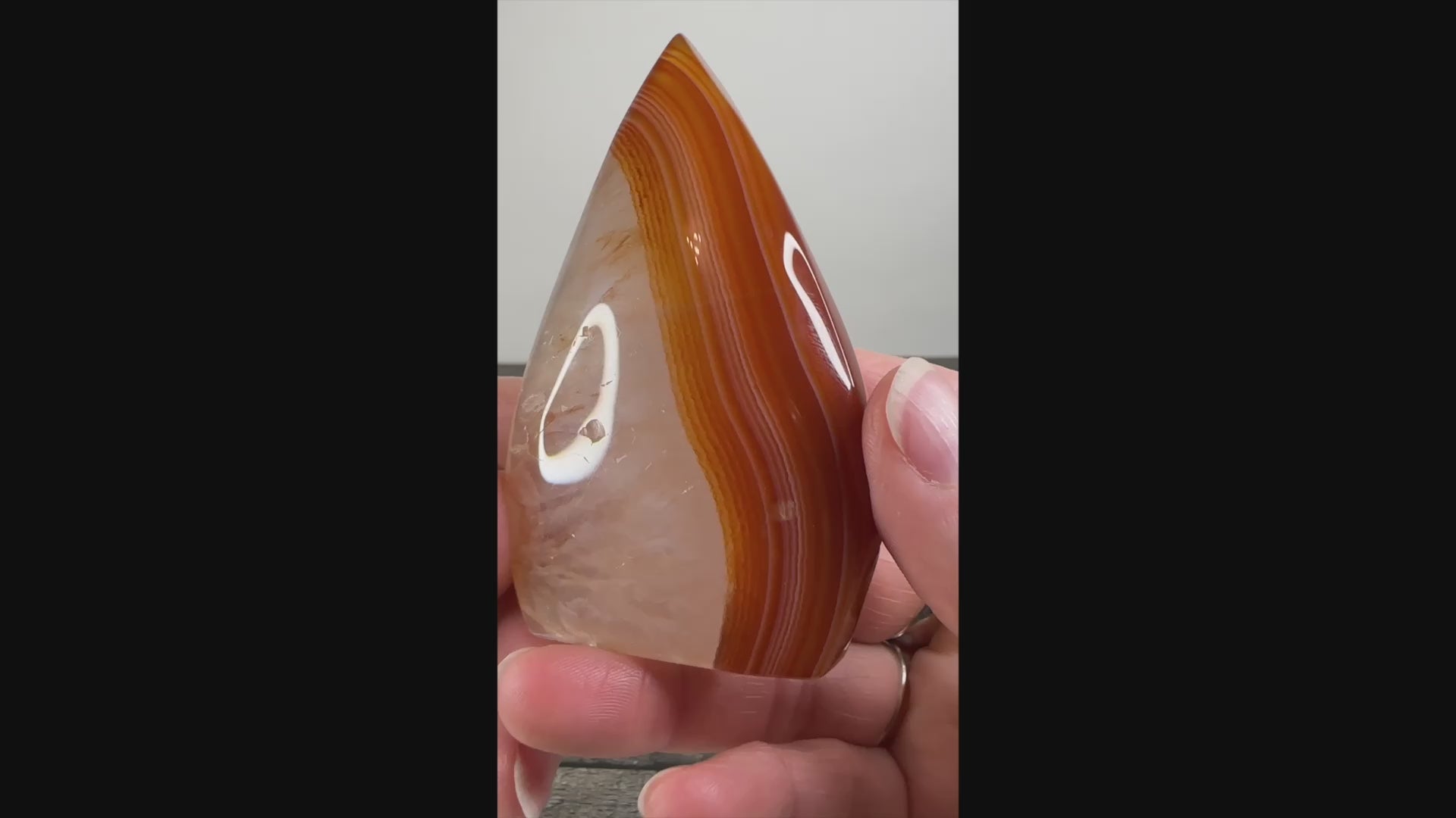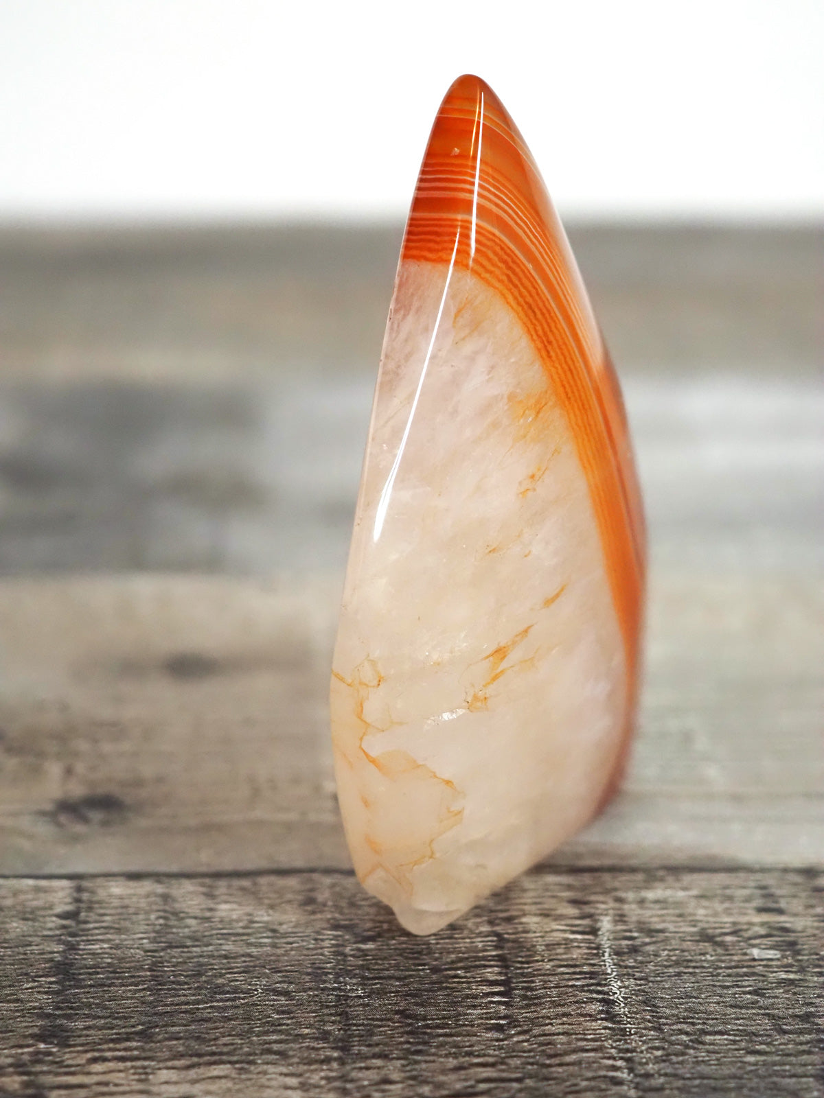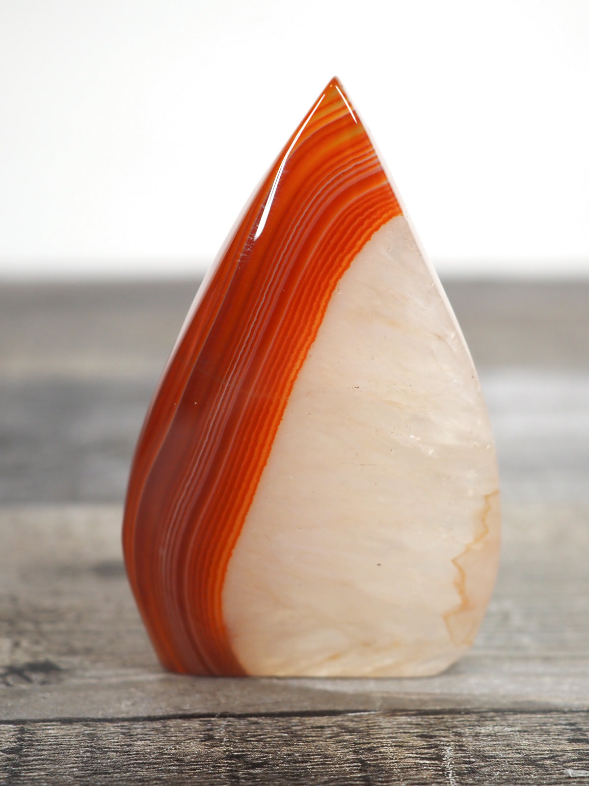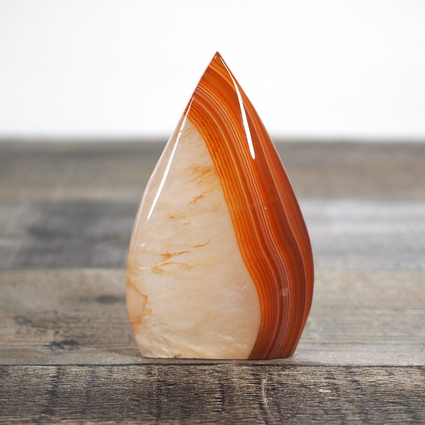 This beautiful mix of dark orange and red Carnelian and sparkly Quartz is carved into a flame shape. The sparkles and rainbows in this piece are particularly lovely, and the orange and red banding reminds us so much of the Fall!