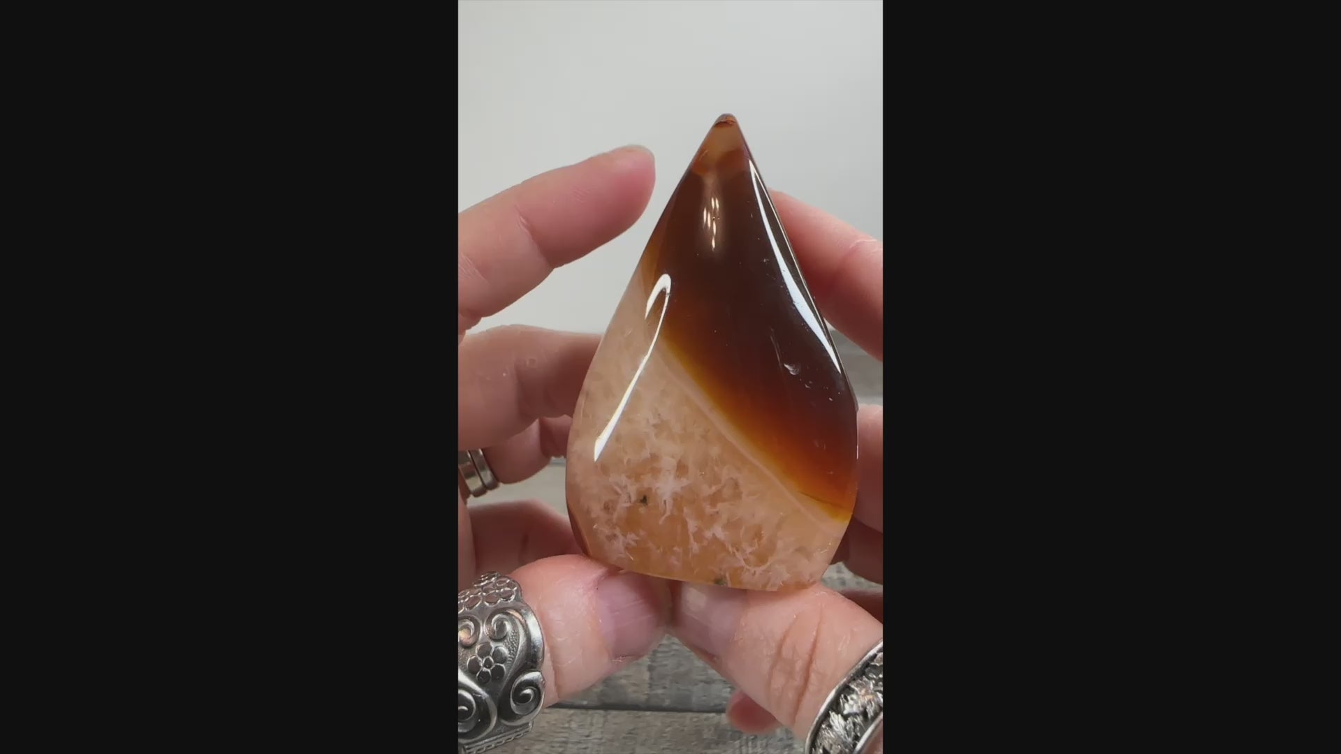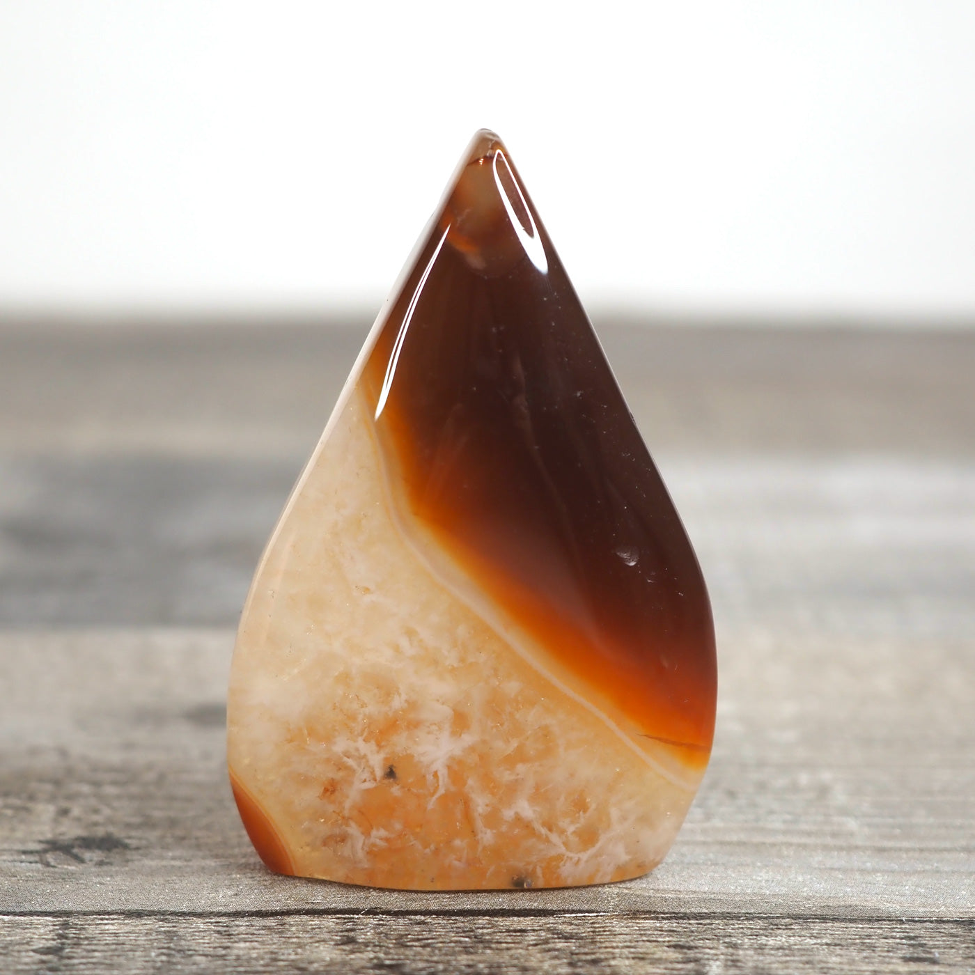This beautiful mix of deep orange Carnelian and sparkly Quartz is carved into a flame shape. It reminds us so much of the Fall!