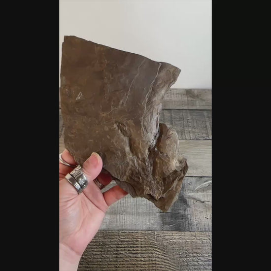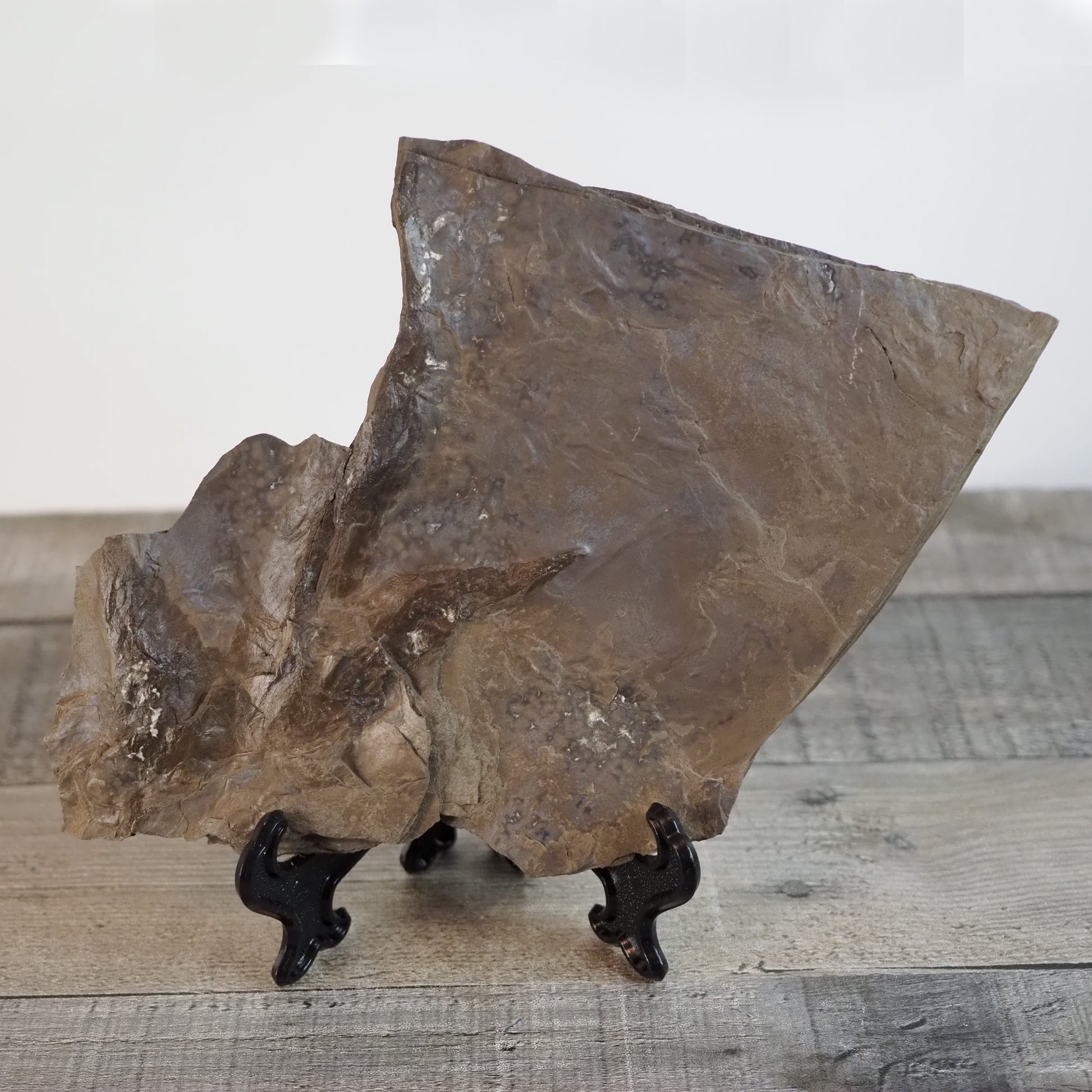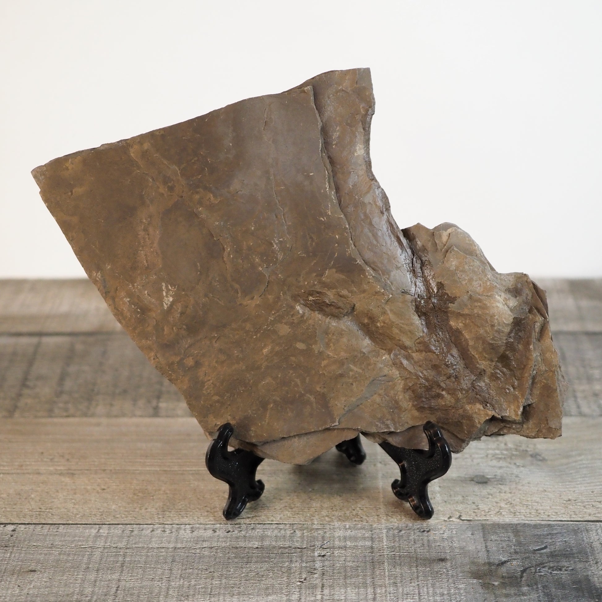 This Anomoepus dinosaur footprint from the Jurassic East Berlin Formation of Connecticut, not far from Connecticut's Dinosaur State Park (It did not come from the park, itself, as gathering specimen is illegal in order to preserve the park's history and beauty.) It is in a matrix about 8" x 5.75", with a print that can be seen from both sides! (Presumably, the print was left in softer sediment, creating a deeper print than most found in this location.). It does have a bit of reinforcement to some of those thinner areas of the print, as is quite normal in this kind of fossil.