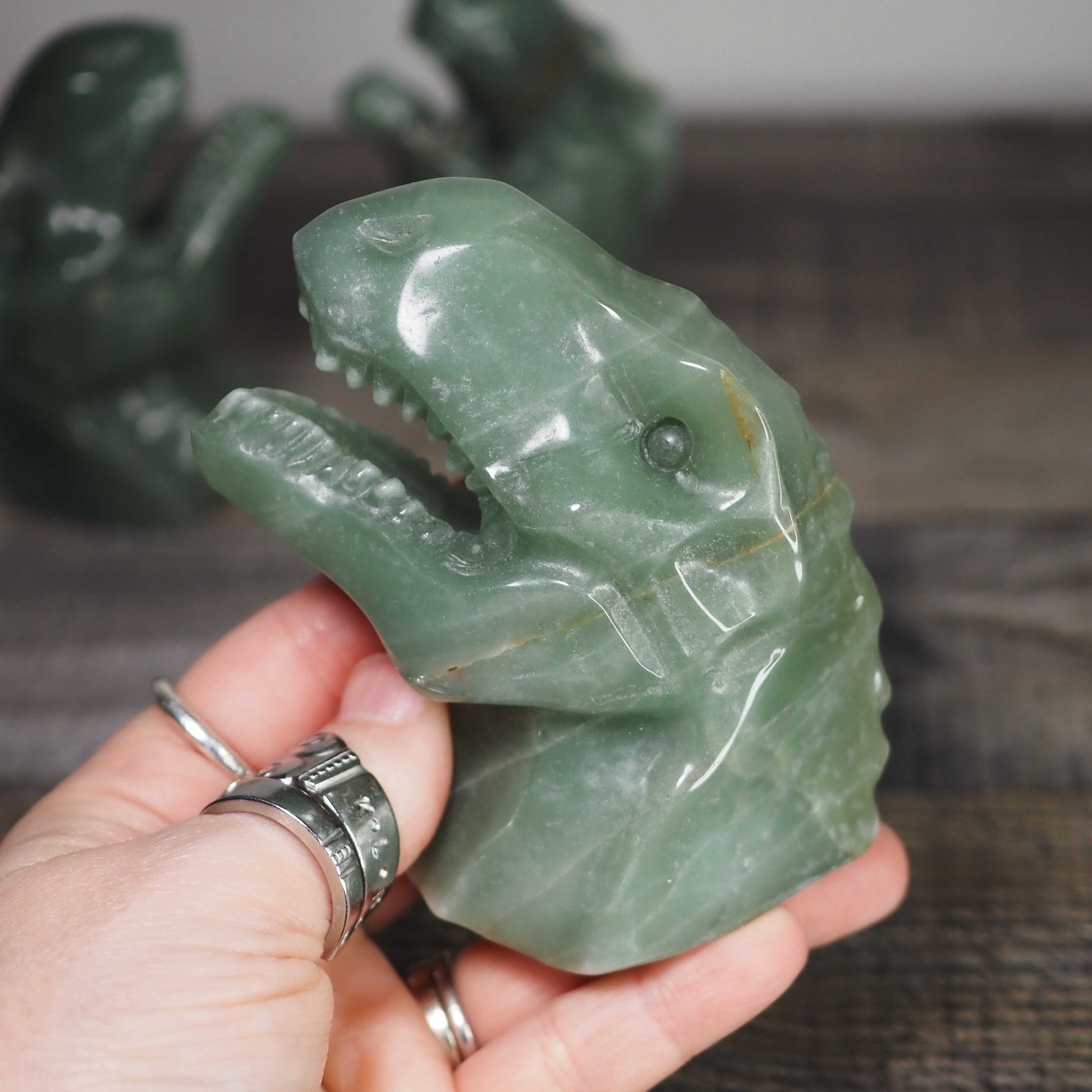 These adorable T-Rexes are hand-carved from Green Aventurine and are around 3.7" tall.