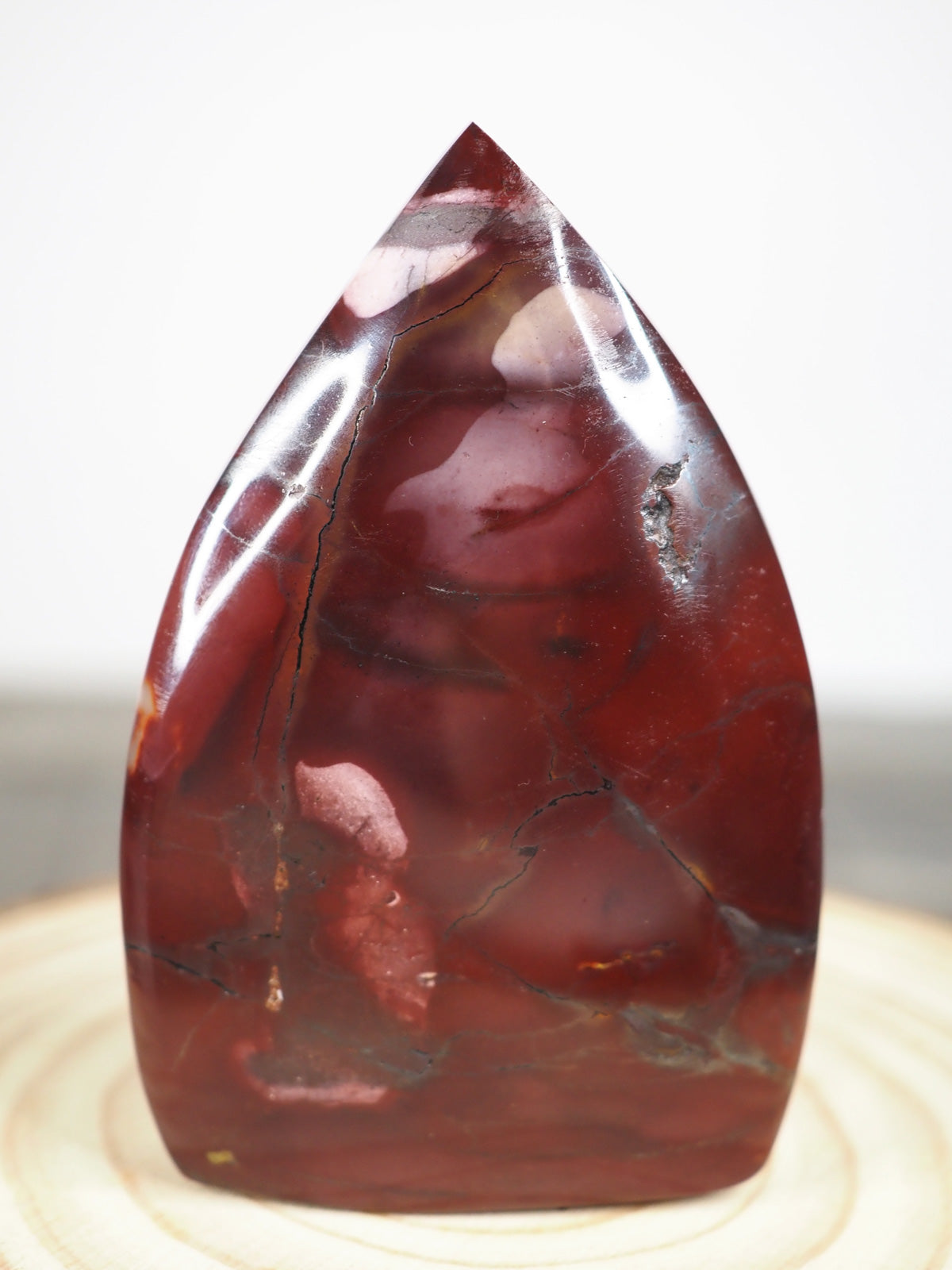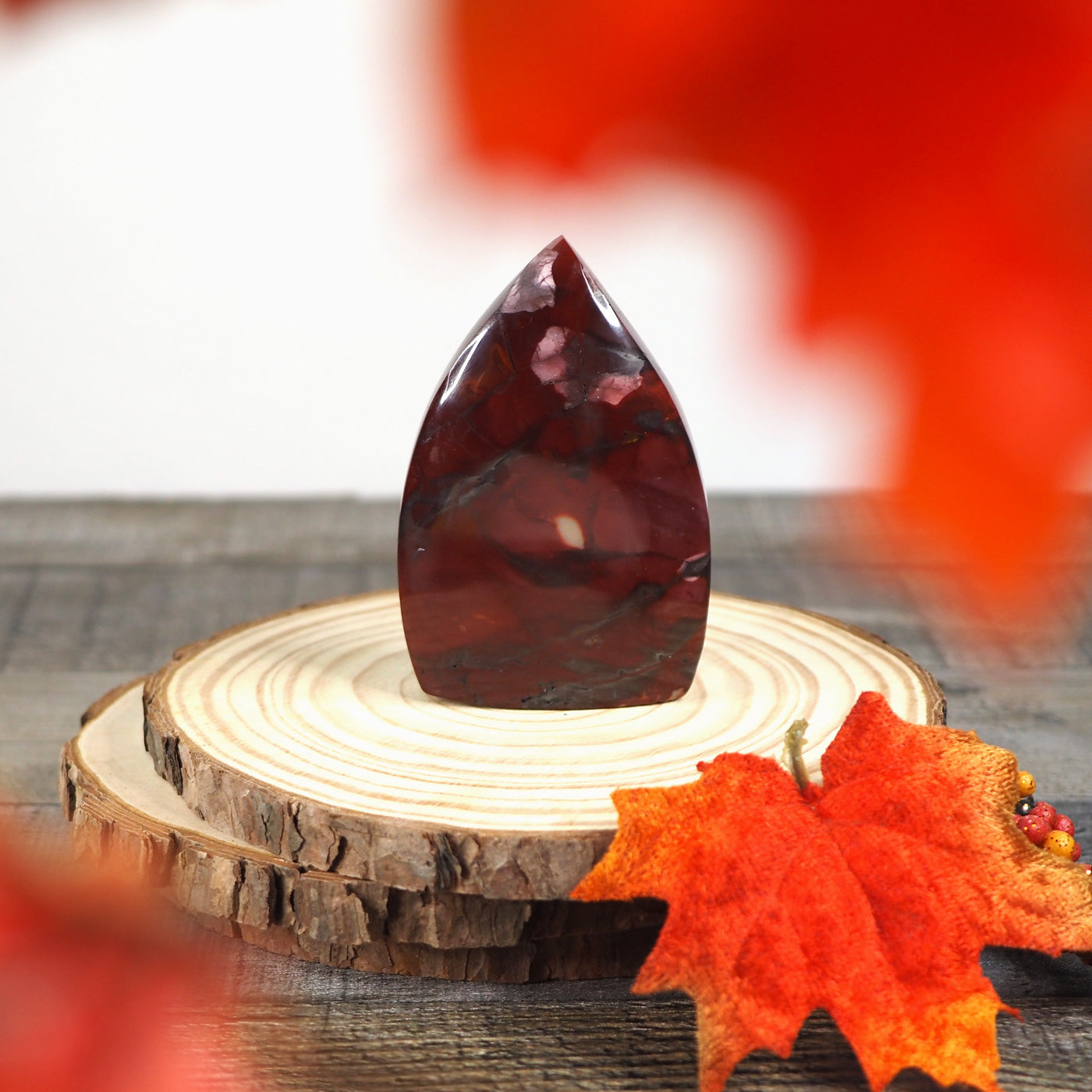 This beautiful mookaite flame carving features deep, dark reds and fascinating fossilized patterns that make mookaite one of our favorite crystals- and definitely gives us Autumn energy!