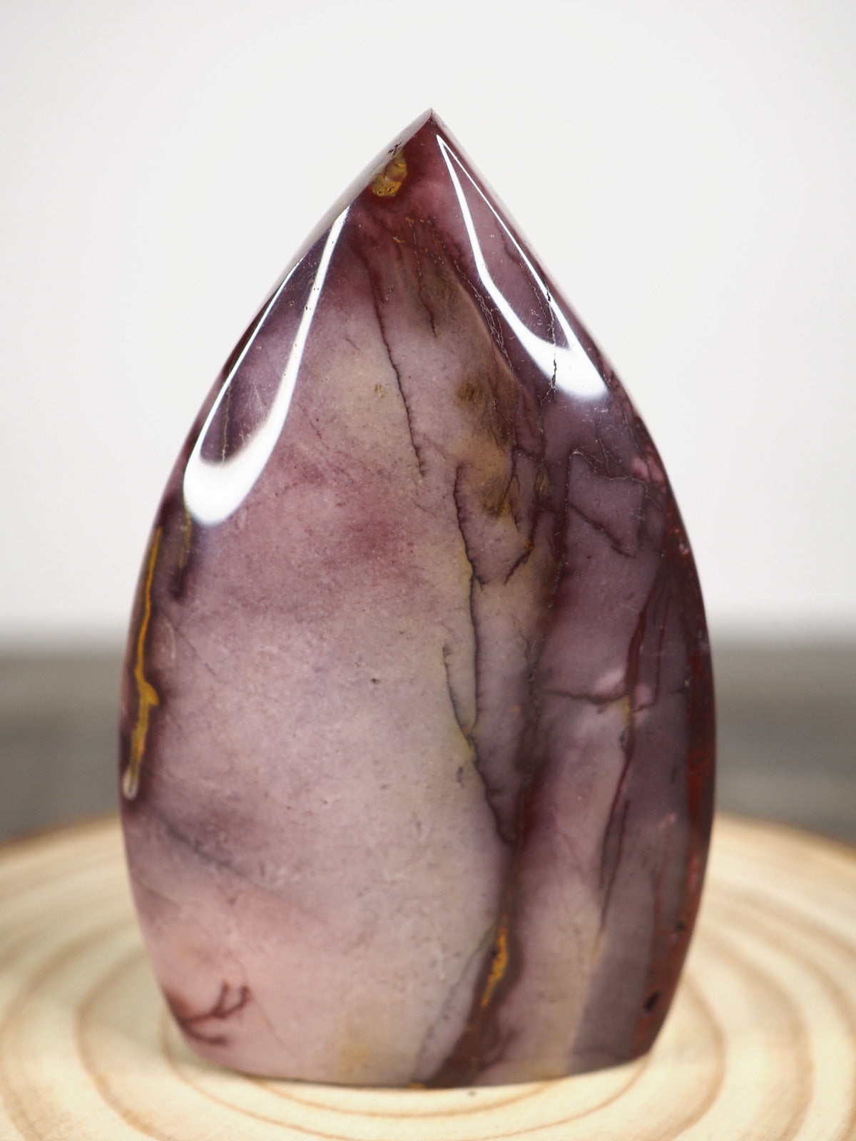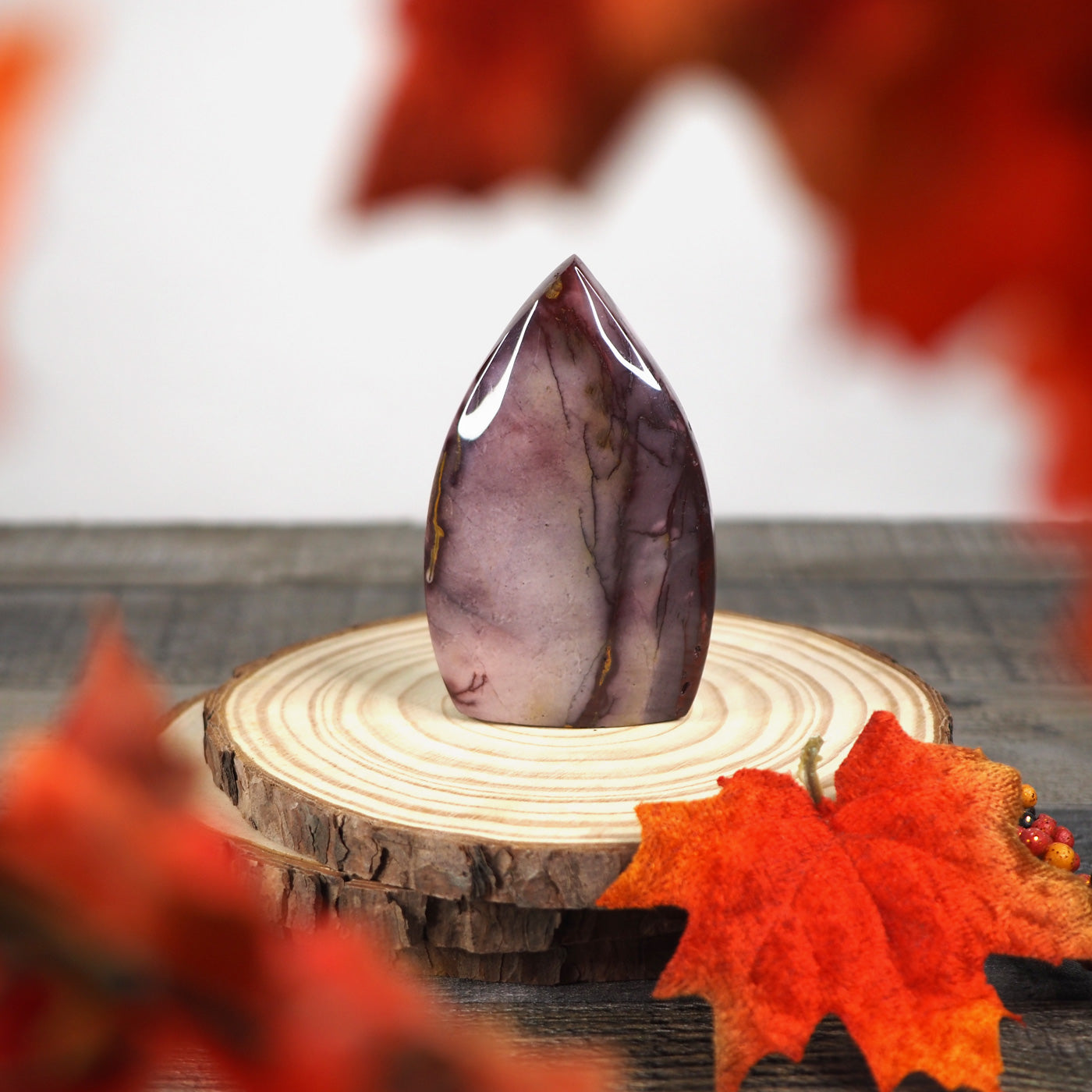 This beautiful mookaite flame carving features deep reds and purples, and fascinating fossilized patterns that make mookaite one of our favorite crystals- and definitely gives us Autumn energy!