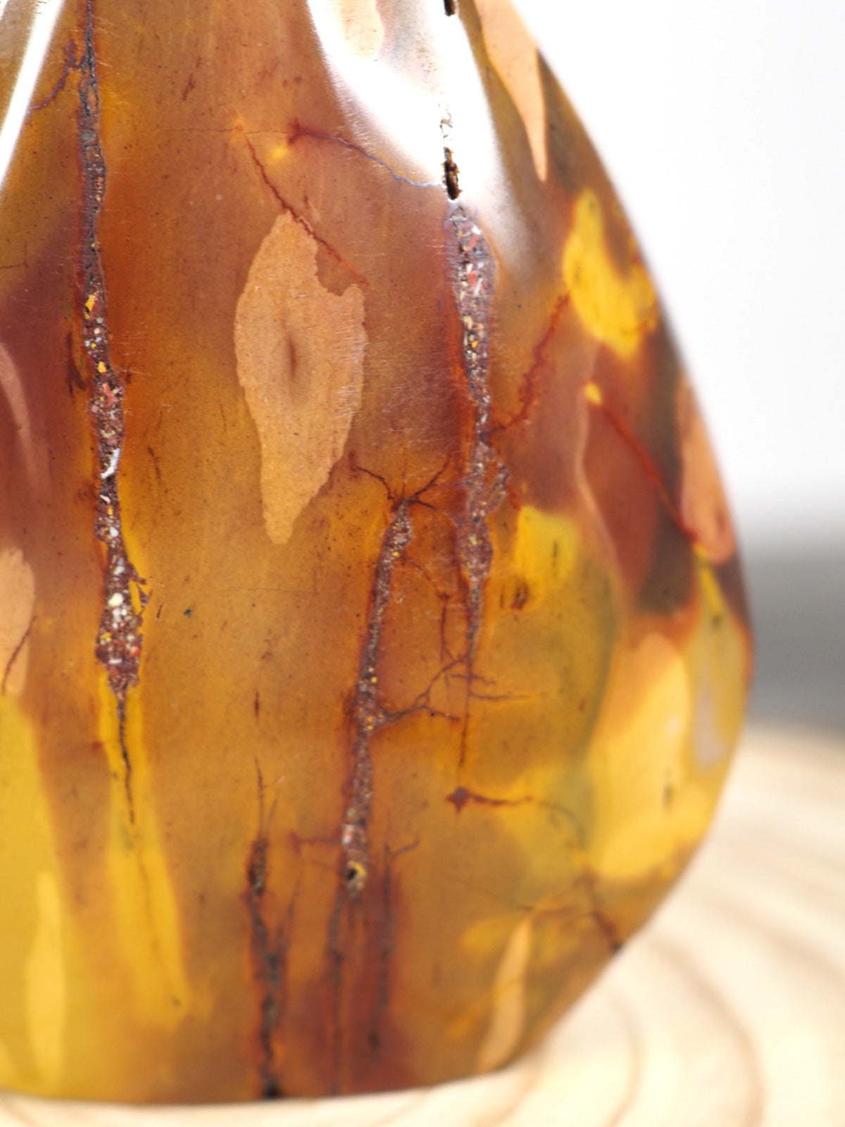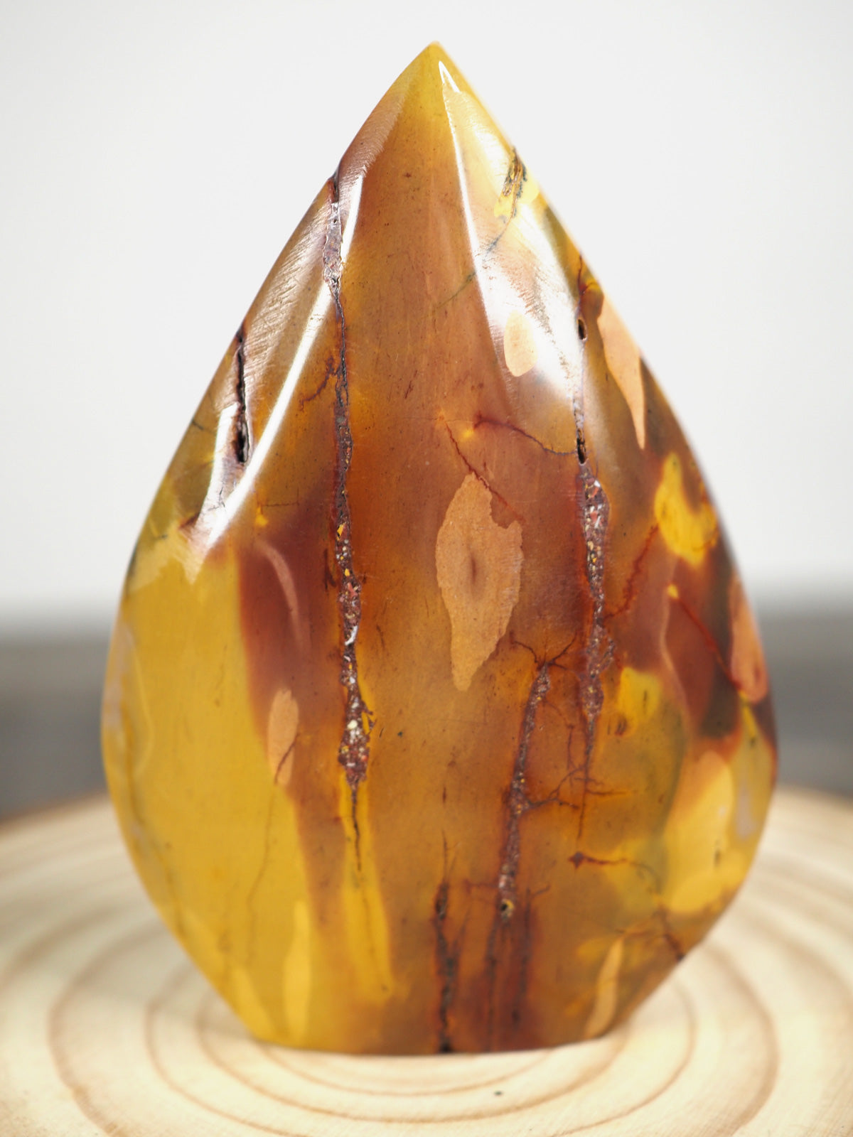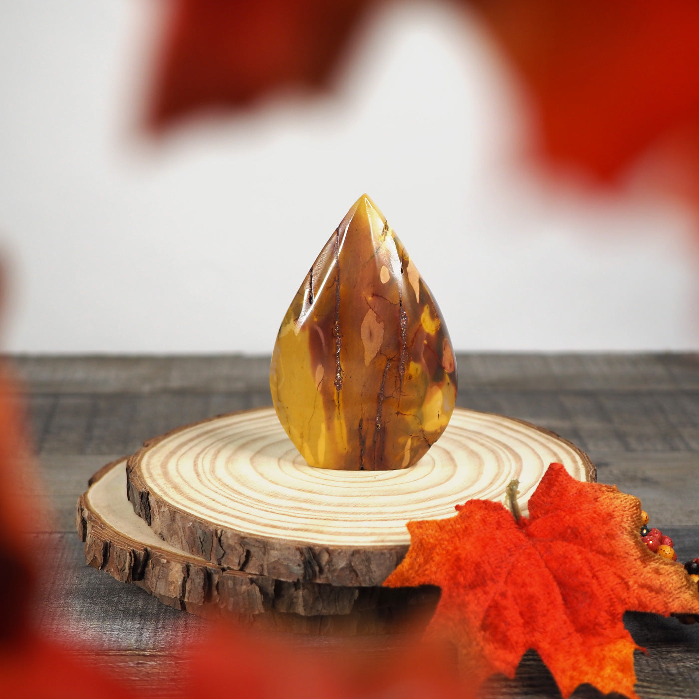 This beautiful mookaite flame carving features deep reds and yellow, and fascinating fossilized patterns that make mookaite one of our favorite crystals- and definitely gives us Autumn energy! (It almost looks like falling leaves!)