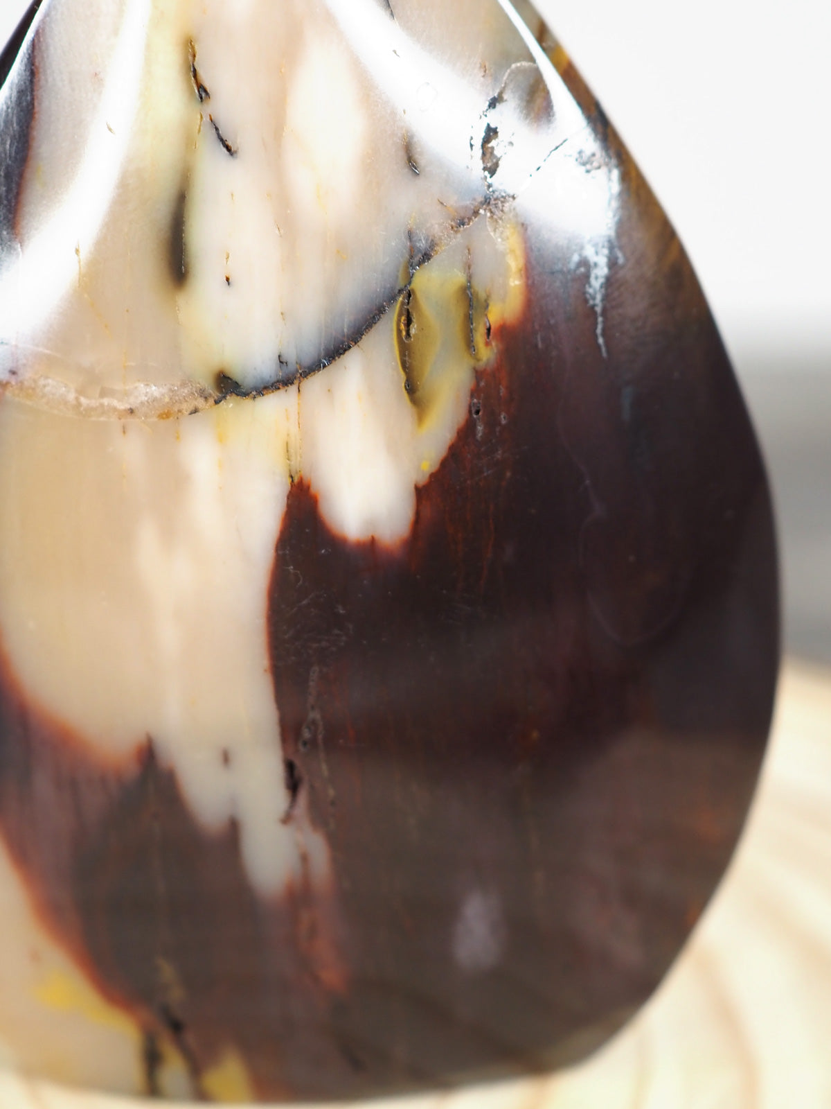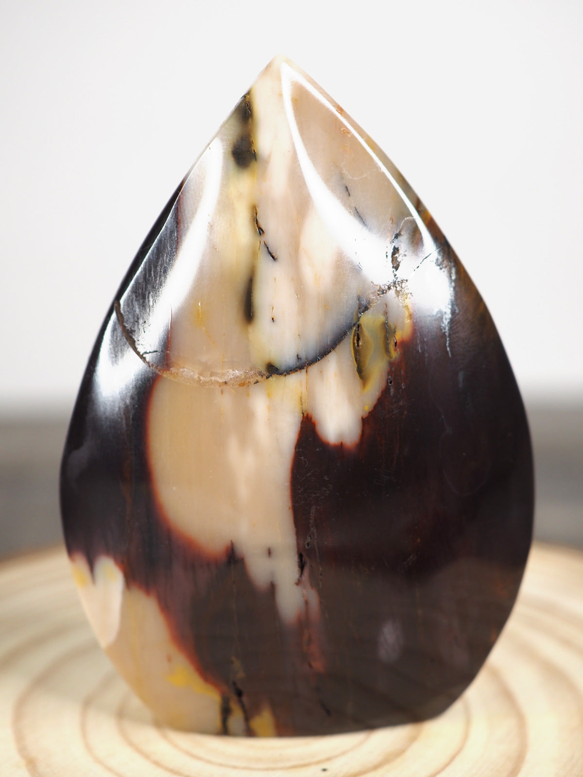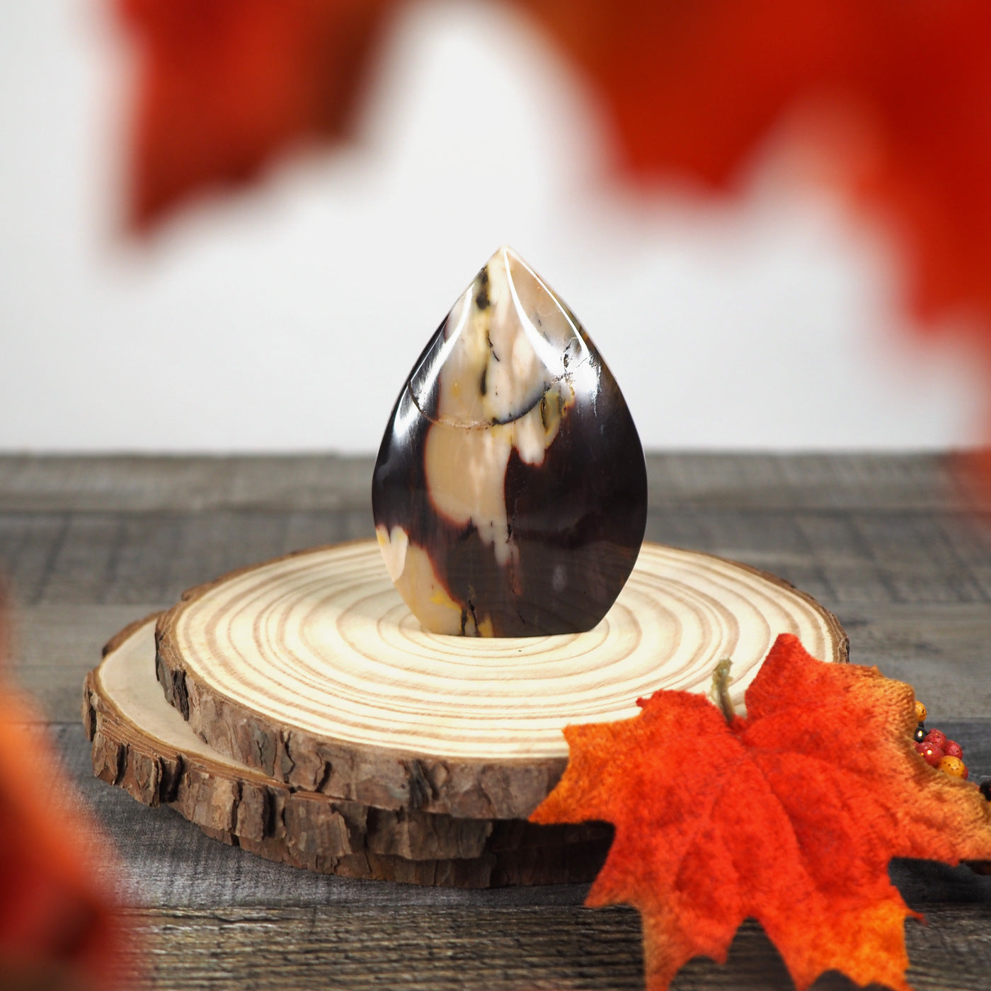 This beautiful mookaite flame carving features deep reds and yellow, and fascinating fossilized patterns that make mookaite one of our favorite crystals- and definitely gives us Autumn energy! (It almost looks like falling leaves!)