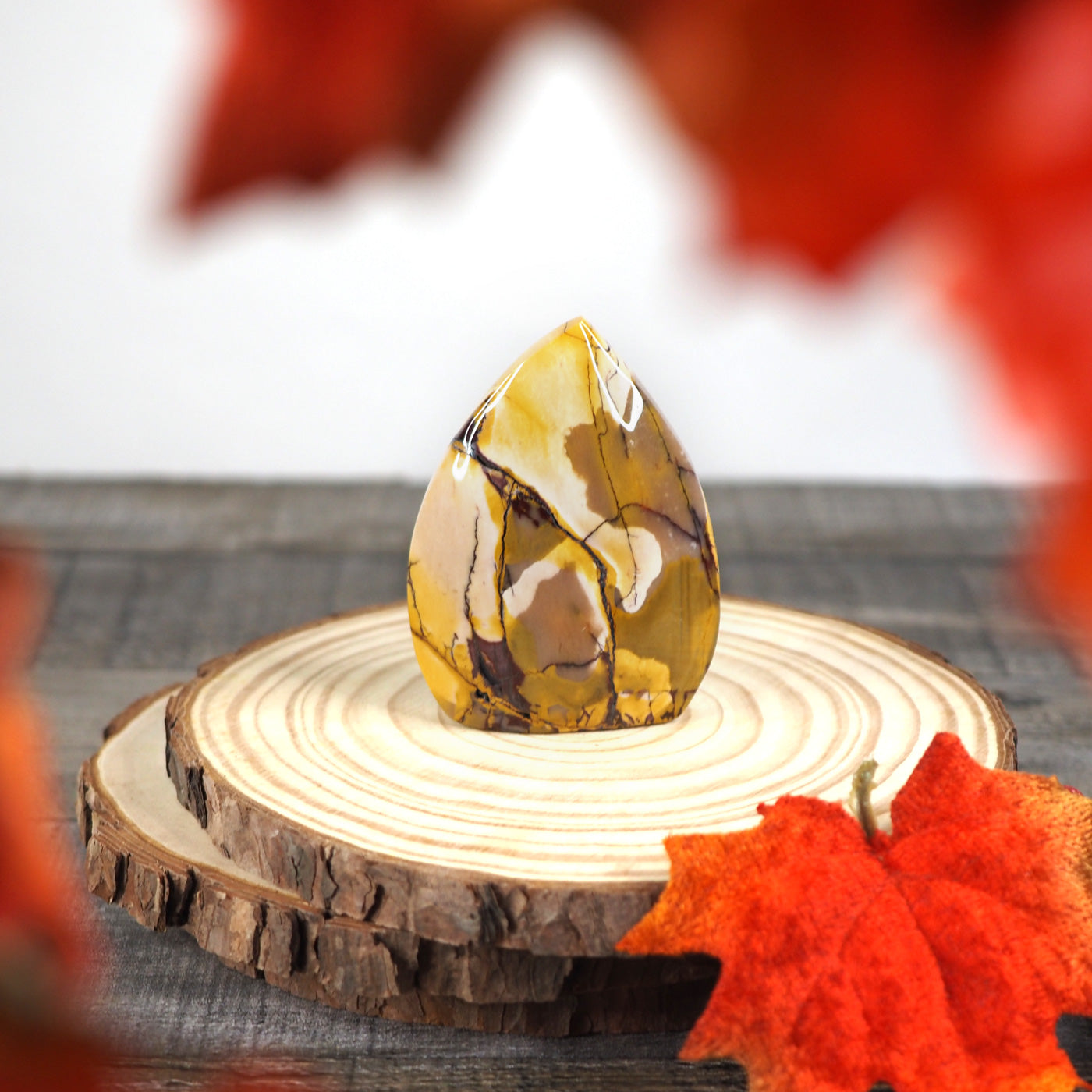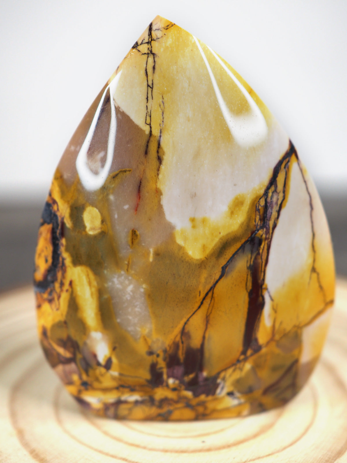 This beautiful mookaite flame carving features deep reds and yellow, and fascinating fossilized patterns that make mookaite one of our favorite crystals- and definitely gives us Autumn energy! (It almost looks like falling leaves!)
