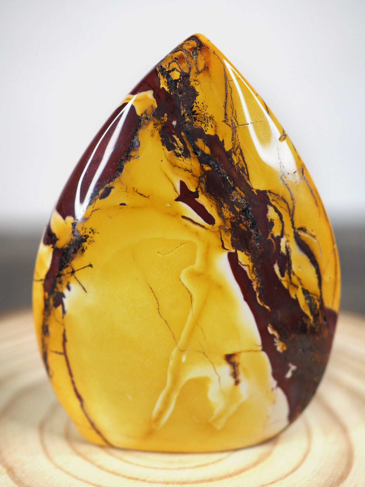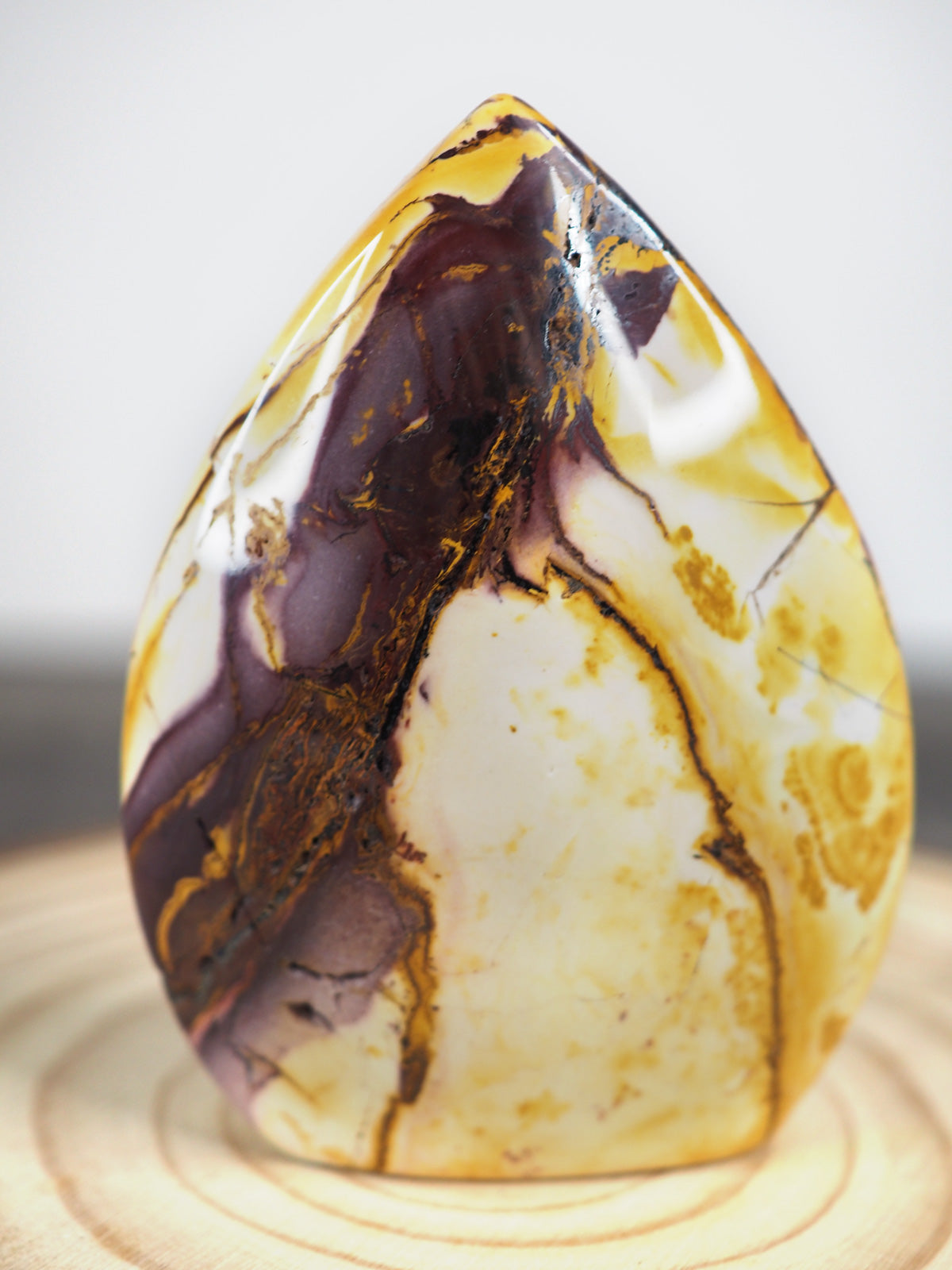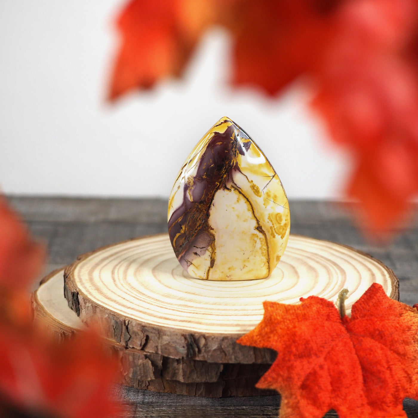 This beautiful mookaite flame carving features deep reds and yellow, and fascinating fossilized patterns that make mookaite one of our favorite crystals- and definitely gives us Autumn energy! (It almost looks like falling leaves!)