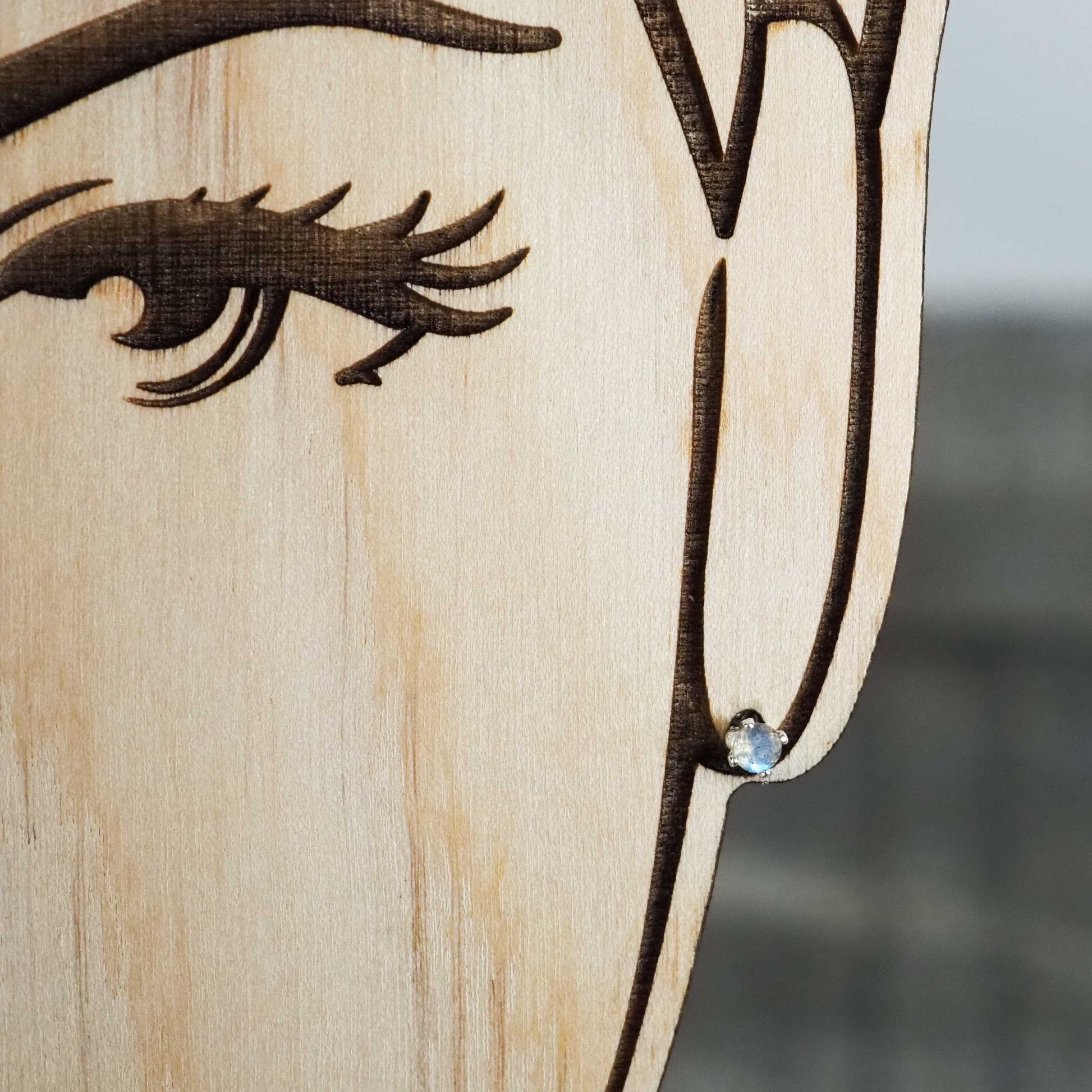 These flashy 3mm earrings are natural Moonstone set into 925 Sterling Silver studs.