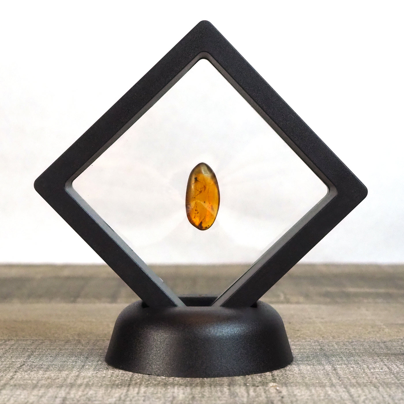This .75" piece of Amber from Myanmar comes in the pictured 4" x 3.75" floating frame and has a tiny fly inclusion.