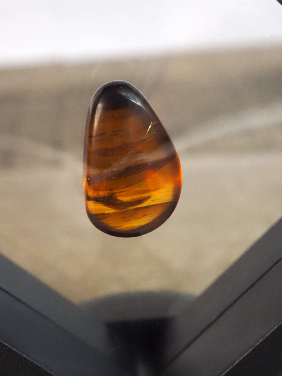 This .75" piece of Amber from Myanmar comes in the pictured 4" x 3.75" floating frame and has a cockroach inclusion along with some beautiful banded layers.