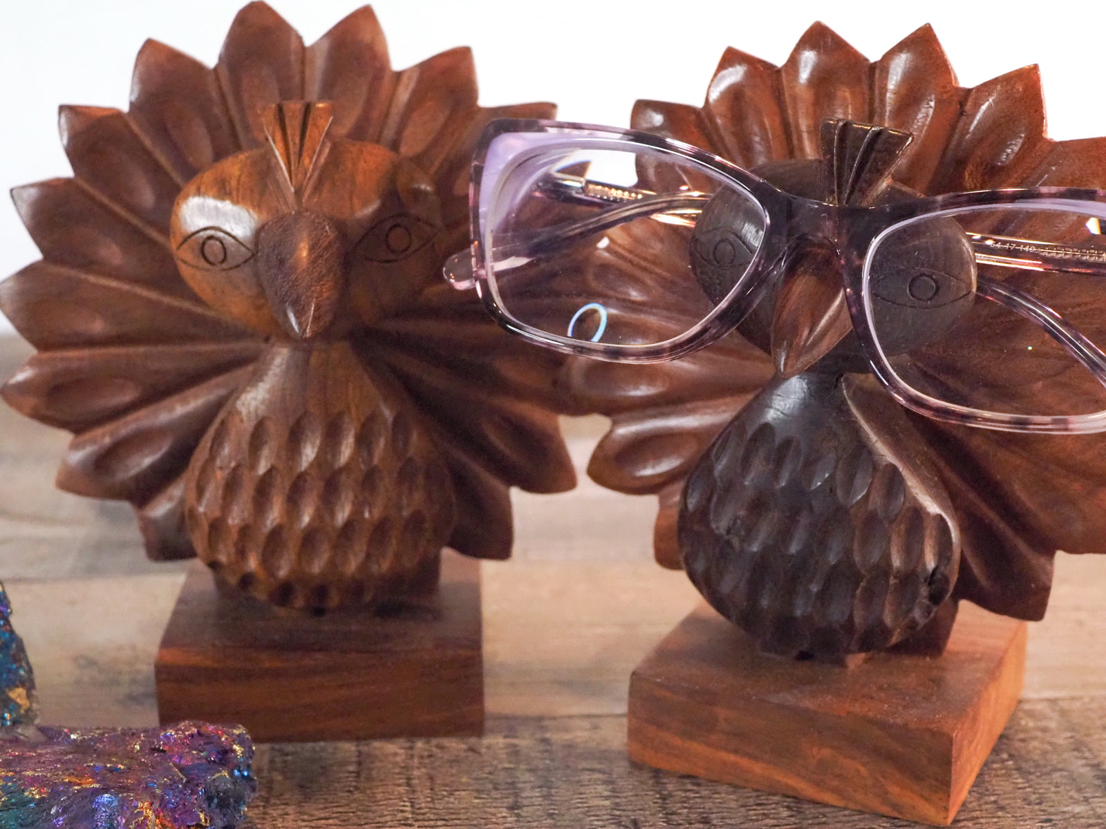This adorable peacock eyeglass holder stand will hold your glasses while adding a bit of whimsy to your life! It is hand-carved in India from ethically-sourced Indian Rosewood. It is around 5.25" x 3" x 6"