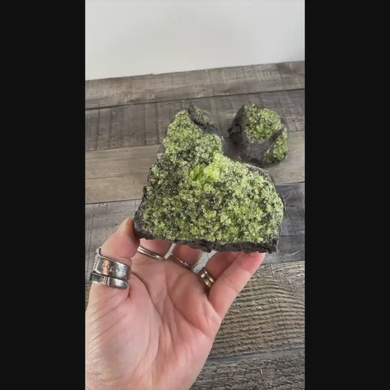 These beautiful deep green peridot crystals on basalt matrix were mined on the San Carlos Apache Reservation near Globe, Arizona. Each specimen is of similar quality and size (3" - 3.5"), and you can trust us to intuitively choose the perfect specimen for you!
