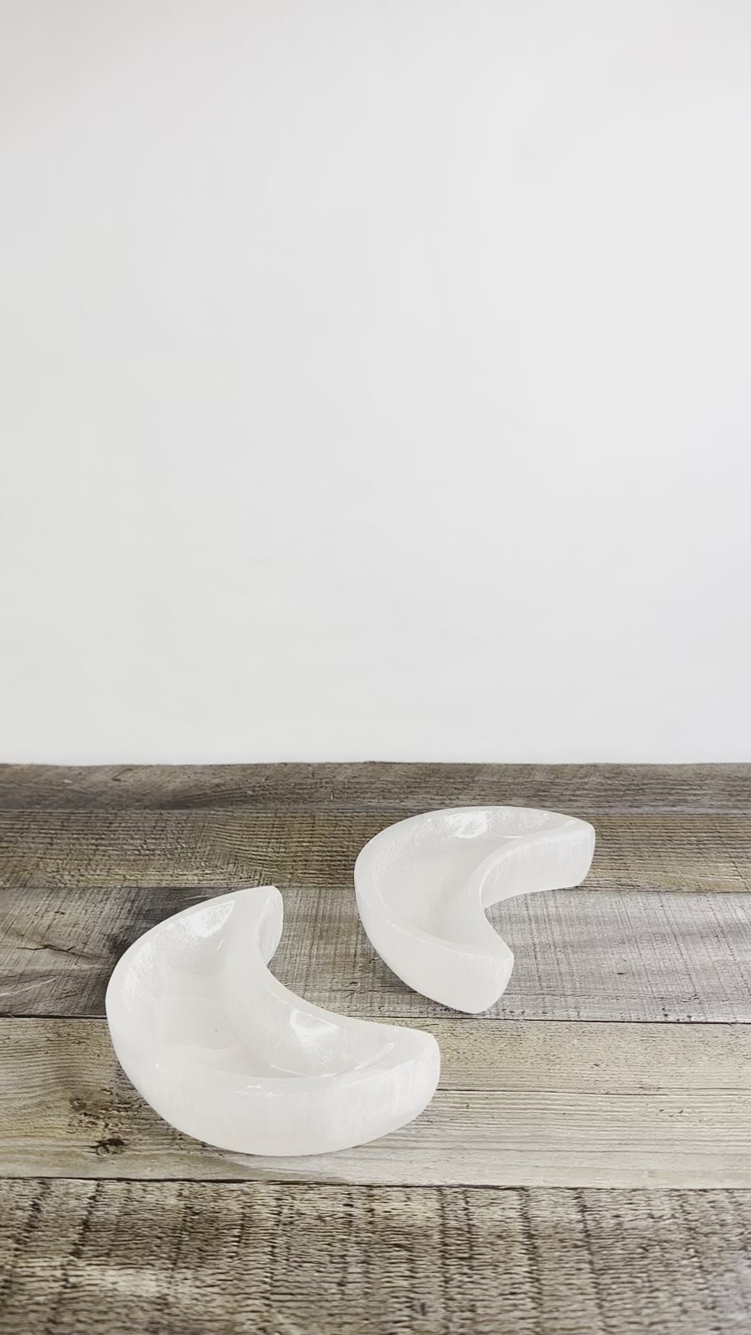 These moon bowls are made of satin spar selenite from Morocco. They are around 4.75" and perfect for keeping your loose tumbles, mini carvings, and more!