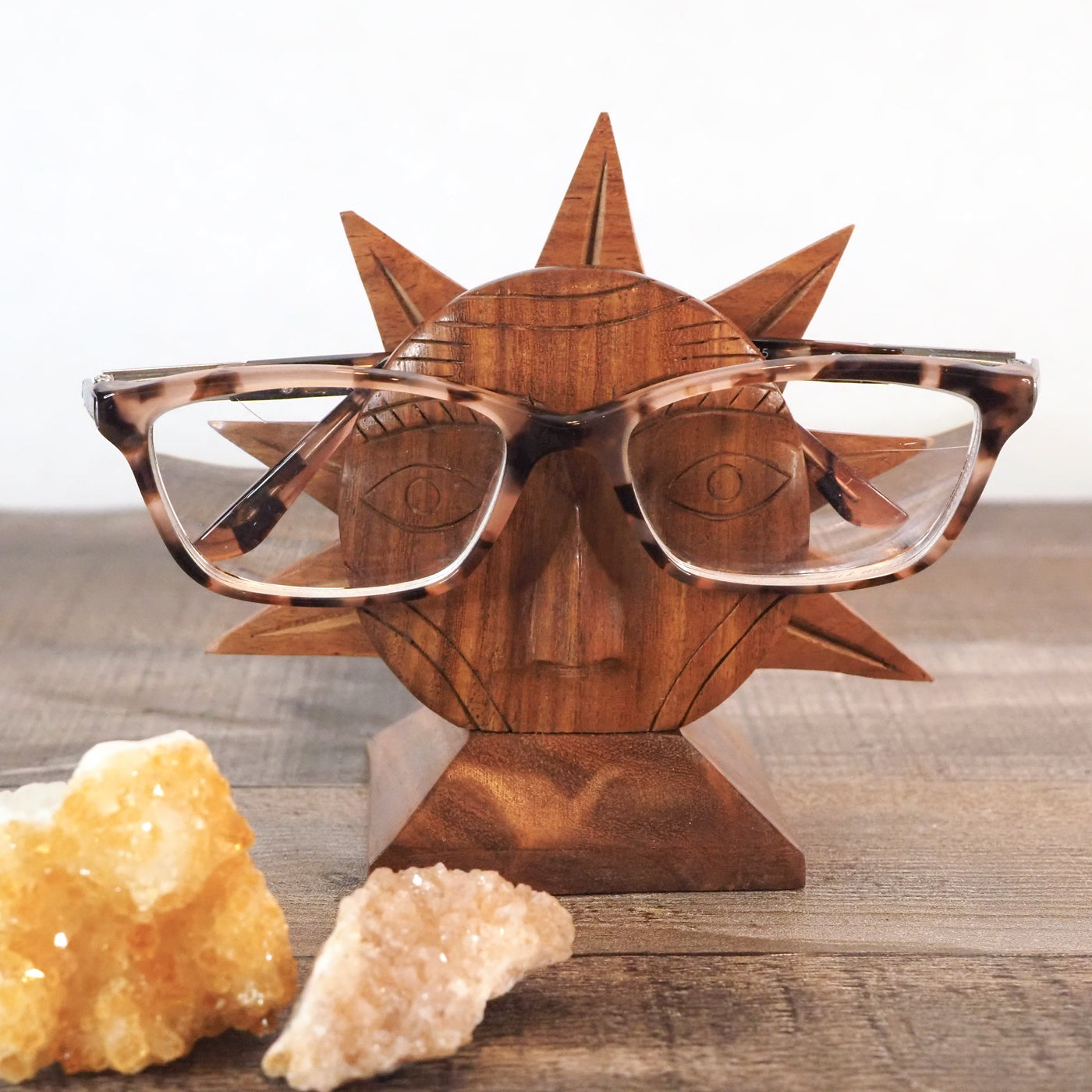 This adorable sunshine eyeglass holder stand will hold your glasses while adding a bit of whimsy to your life! It is hand-carved in India from ethically-sourced Indian Rosewood. It is around 4.5" tall x 1.75" x 3.75"