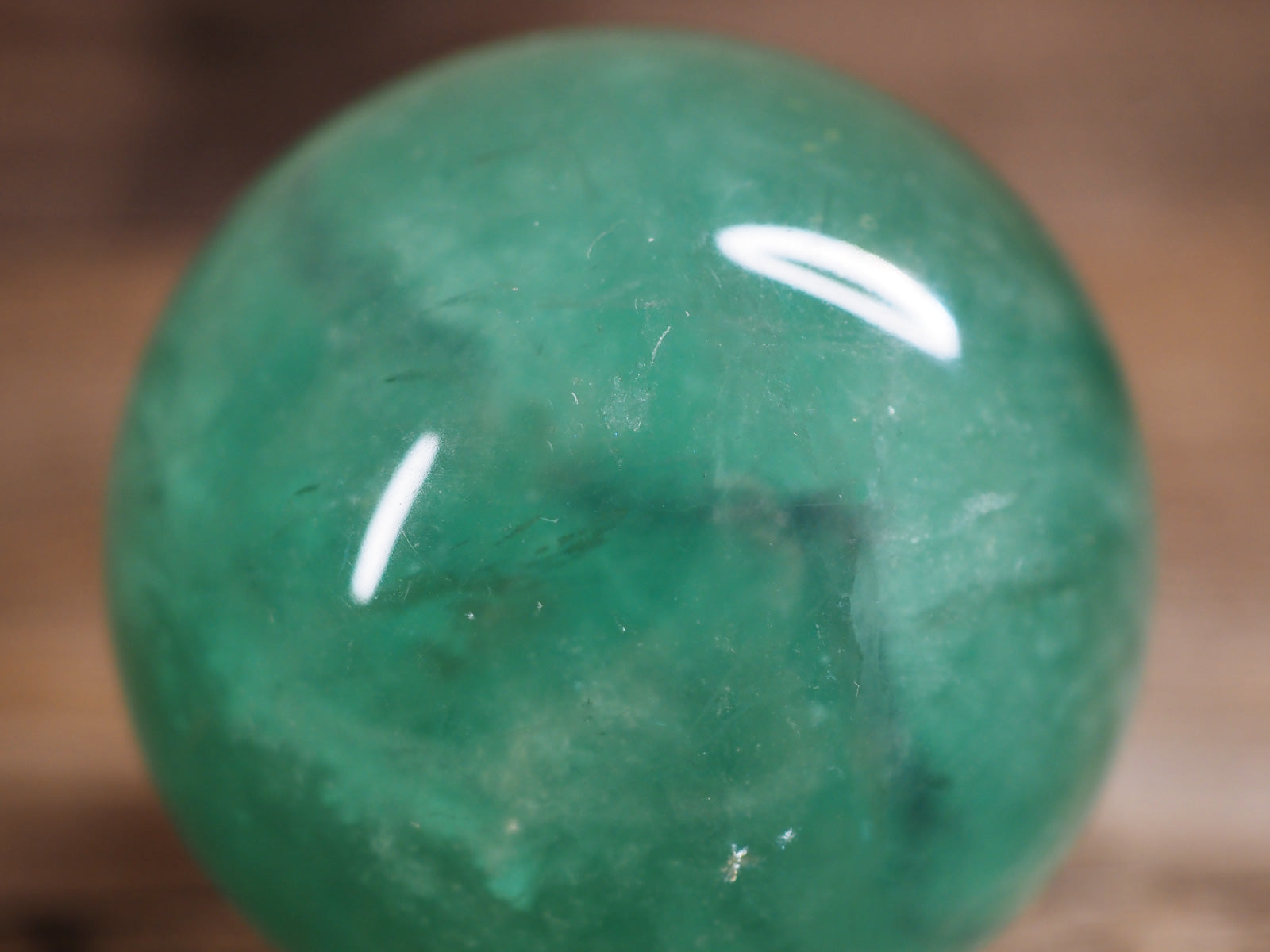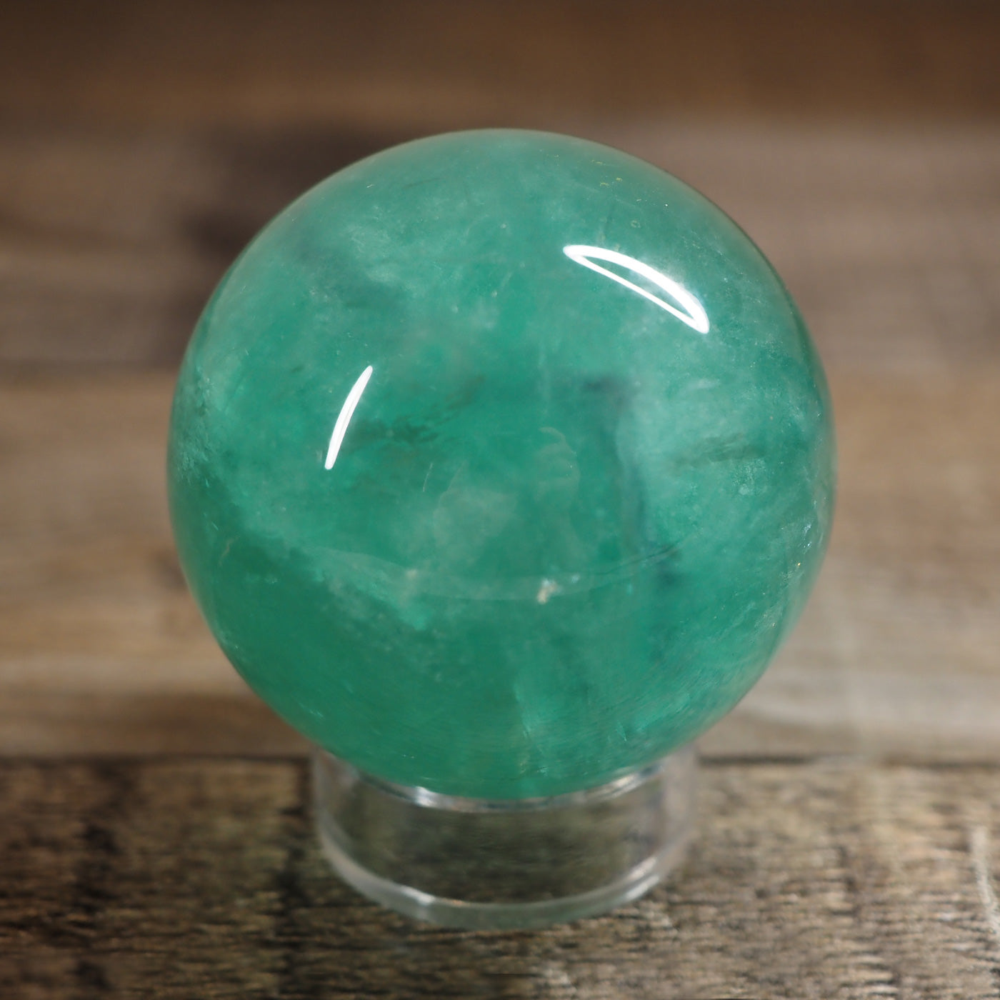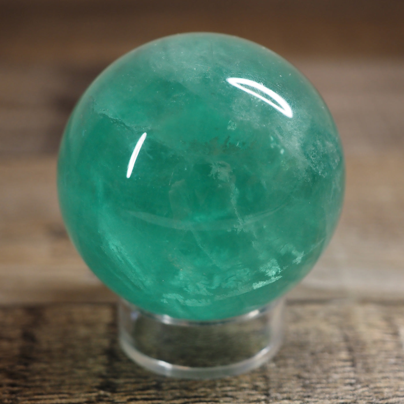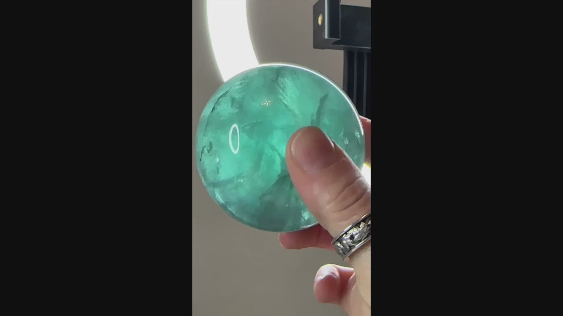 This beautiful translucent turquoise green fluorite sphere with a gorgeous purple vein is 52mm.