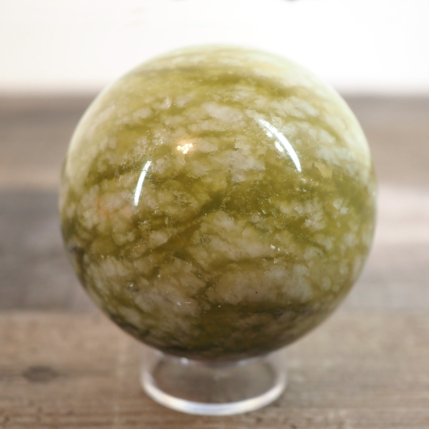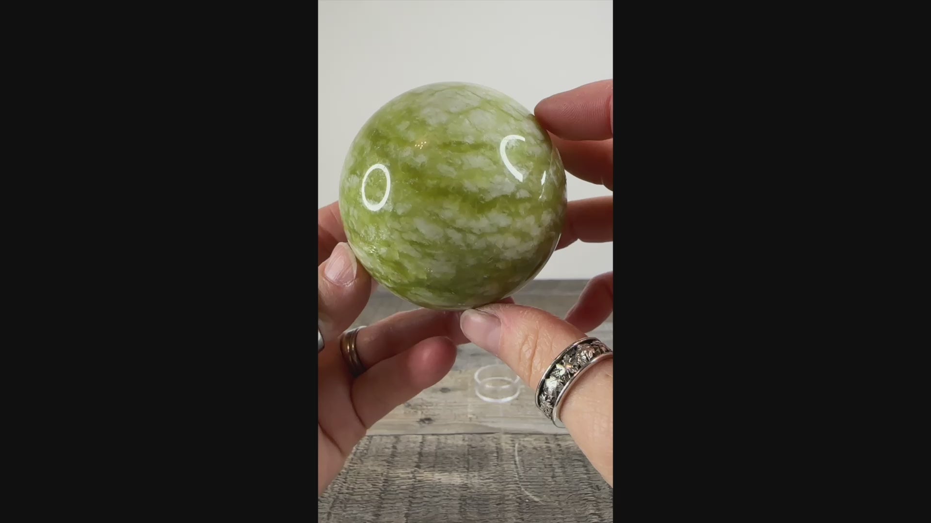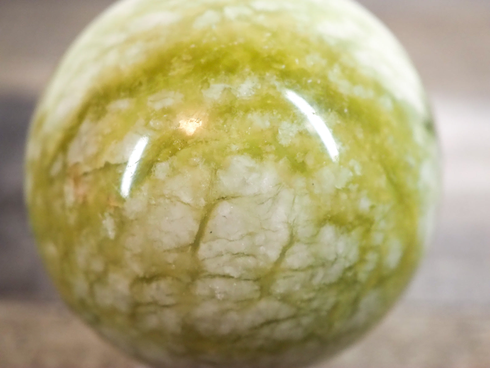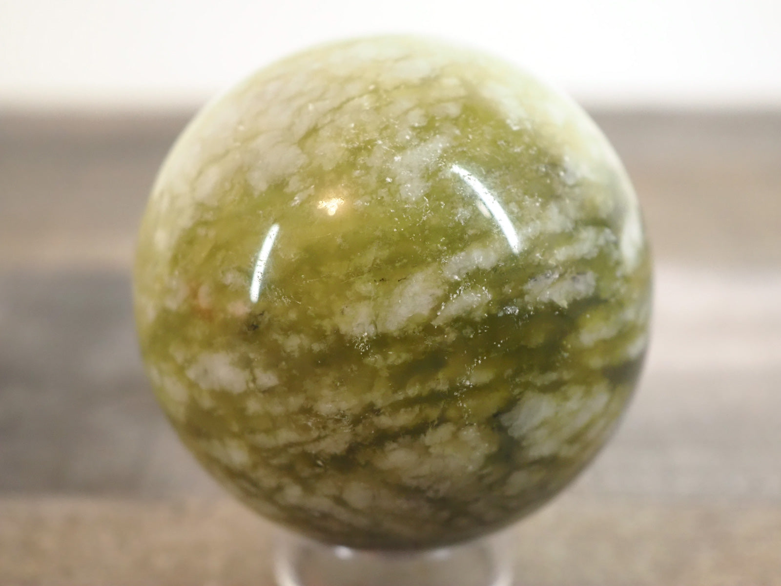 This beautiful Xiuyan Jade Sphere is 64mm (about 2.5")